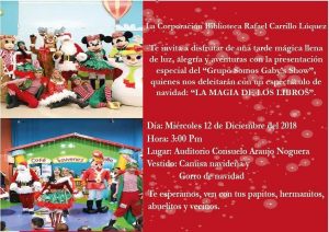La Corporación Biblioteca Rafael Carrillo Lúquez, te invita a disfrutar de una tarde mágica llena de luz, alegría y aventuras con la presentación del «Grupo Somos Gaby’s Show», quienes nos deleitarán con un espectáculo de navidad: «LA MAGIA DE LOS LIBROS».