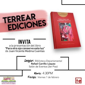 La Corporación Biblioteca Rafael Carrillo Lúquez Invita al lanzamiento del libro “Para otro ojo conservo esta luz” del autor, Juan Vicente Medina Cuentas. Totalmente Gratis Lugar: