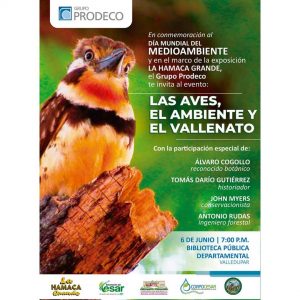 En conmemoración al día mundial del MEDIOAMBIENTE y en el marco de la exposición LA HAMACA GRANDE, el Grupo Prodeco y la Gobernación del Cesar a través de la Biblioteca Rafael Carrillo Lúquez, invitan al evento: «Las aves, el medio ambiente y el Vallenato». Día: 6 de junio