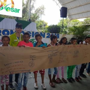 En la Ruta del Desarrollo y la Paz N. 16, La Corporación Biblioteca Rafael Carrillo Lúquez lleva su oferta Institucional al municipio de Chimichagua, Cesar los niños en el Stand disfrutan de diferentes actividades lúdicas y participan del Mural de la Alegría, espacio donde escriben cada deseo de mejora para su municipio.