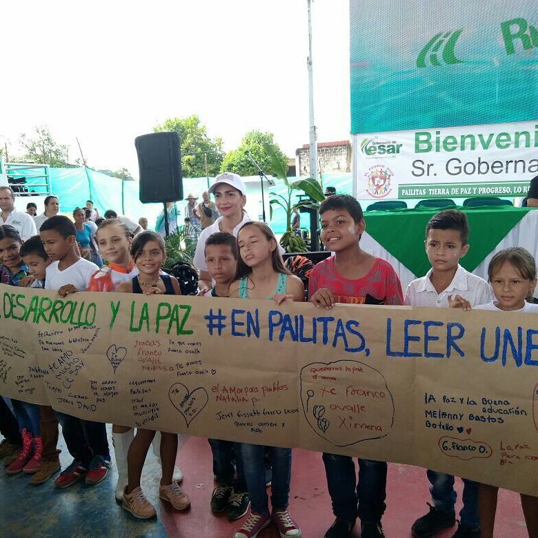 El municipio de Pailitas es objeto de visita de la Ruta del Desarrollo y La Paz. La directora de la Biblioteca Departamental María Victoria Celedon Simón acompañó a los niños a publicar sus mensajes en el muro de la paz dispuesto durante la visita. La Biblioteca Rafael Carrillo Lúquez acompaña la jornada ofreciendo a los niños de la comunidad la lectura de cuentos infantiles, dibujo.