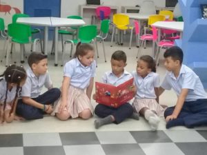 Recibimos la visita de los niños de cuarto y quinto grado del colegio » Chicos Ingeniosos» se les hizo una lectura compartida con el libro » Mi mascota» del escritor Bob Staake.