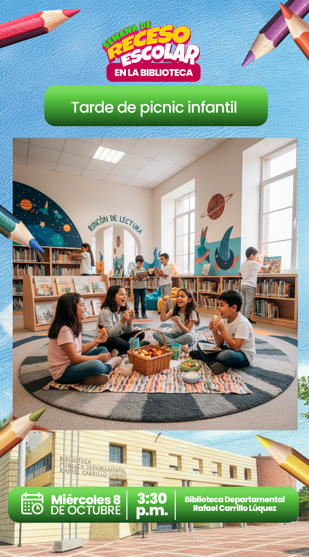 ¡Es hora de llevar los libros y la diversión afuera! Únete a nuestra Tarde de Picnic Infantil, donde combinaremos el placer de la lectura con un delicioso momento al aire libre. Trae tu manta, tu snack favorito y prepárate para escuchar cuentos emocionantes contados bajo el cielo. Será una tarde mágica para compartir historias, hacer nuevos amigos y disfrutar del sol. ¡Los libros saben mejor con un poco de aire fresco y mucha risa!