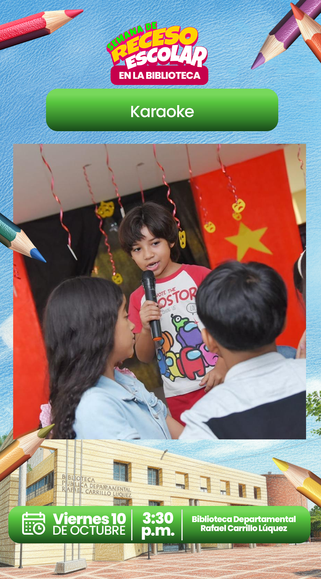 Biblioteca Rafael Carrillo Lúquez - Sala Infantil Consuelo Araujo Noguera de la biblioteca departamental Rafael Carrillo LúquezVen a dejar tu voz en alto y a disfrutar de una tarde llena de música y sonrisas. ¡Tu escenario te espera!