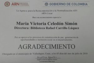 La Corporación Biblioteca Rafael Carrillo Luquez, recibió por parte del Director de la Agencia para la Reintegración y Normalización ARN, señor Andrés Stapper, reconocimiento por el apoyo prestado al proceso adelantado por los 296 excombatientes que culminaron exitosamente la ruta de reintegración. El Cesar por la ruta de la lectura y la paz